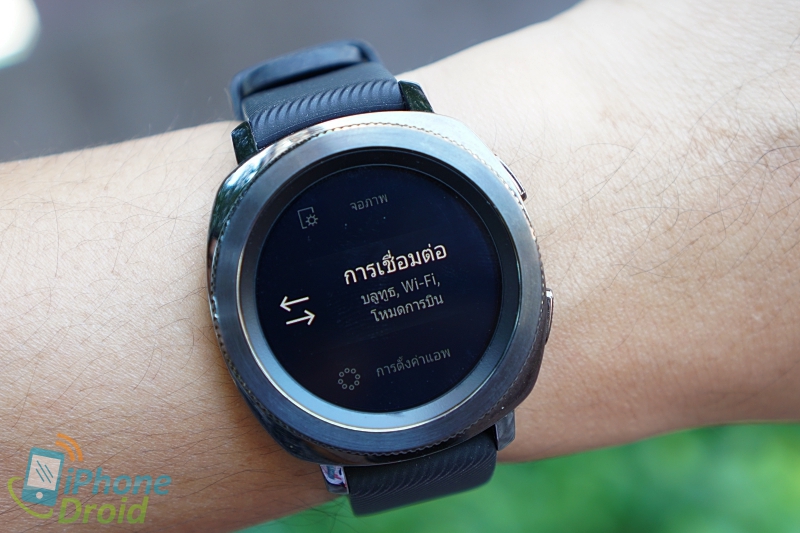 สายที่มากับ Samsung Gear Sport ในรีวิวนี้เป็นสายยางสีดำ (ในไทยวางจำหน่ายมีสีน้ำเงินด้วย) ซึ่งสายข้อมือที่เป็นวัสดุยางจะช่วยให้เวลาใส่นั้นมีความยืดหยุ่นได้ดีกว่า เหมาะกับการออกกำลังกายมากกว่าวัสดุชนิดอื่นที่เป็นสายหนังและสายเหล็ก สายที่ให้มาเป็นไซส์ L ขนาด 20mm สามารถกดที่สลักเพื่อถอดเปลี่ยนสายได้