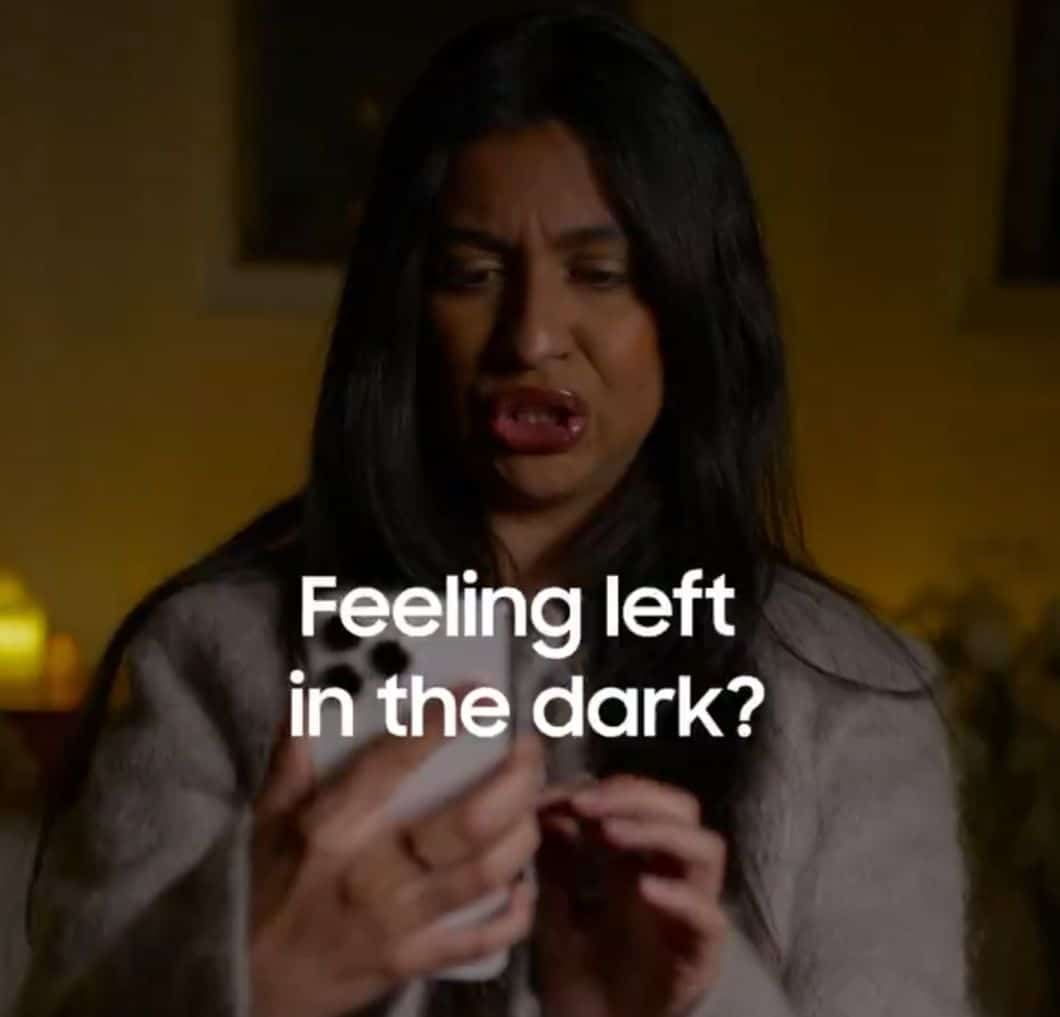 คลิปที่ SamsungMobileUS โพสต์บน X ทาง Samsung ได้แสดงภาพผู้หญิงคนหนึ่งกำลังบันทึกช่วงเวลาที่ผู้ชายมอบแหวนให้คู่รักของเขา โดยจะเห็นว่าพวกเขาโพสท่าซ้ำแล้วซ้ำเล่าเพราะ iPhone ถ่ายภาพได้ไม่ดีตามที่ต้องการ จากนั้นก็มีข้อความขึ้นมาว่า “Feeling left in the dark?” หรือแปลว่า “รู้สึกเหมือนถูกทิ้งไว้ในความมืดหรอ?”