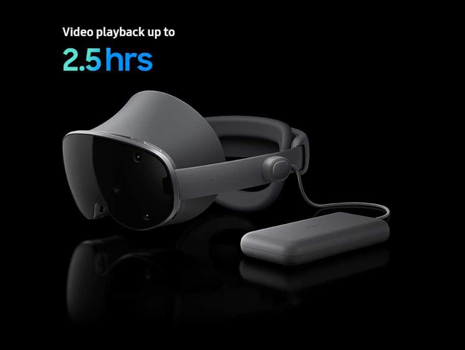 Samsung ยังบอกด้วยว่า Headset รุ่นนี้ออกแบบให้กระจายแรงกดบนหน้าผากและด้านหลังศีรษะของผู้ใช้เพื่อให้สวมใส่สบายยิ่งขึ้น การแยกแบตเตอรี่ออกจากตัวเครื่องยังช่วยลดน้ำหนักที่ศีรษะและคออีกด้วย โดยแบตเตอรี่ใช้งานในการดูวิดีโอ 2 มิตินานสูงสุด 2.5 ชั่วโมง แต่ถ้าใช้งานทั่วไปสามารถใช้งานได้ประมาณ 2 ชั่วโมง