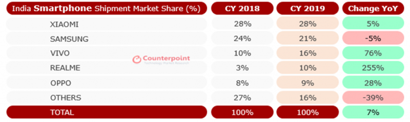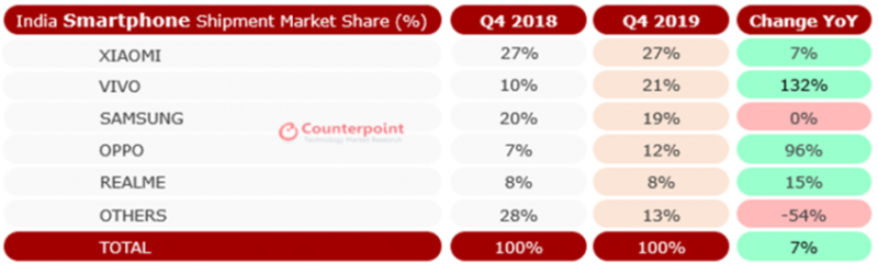 จากตาราง Vivo และ Samsung นั้นมียอดขายใกล้เคียงกันมากๆ โดย Samsung ทำส่วนแบ่งได้ที่ 19% ขณะที่ Vivo ทำได้ 21% ในช่วงเดือนตุลาคมถึงธันวาคมปี 2019 ขณะที่ Xiaomi ก็ยังคงนำอยู่ด้วยส่วนแบ่ง 27% อย่างไรก็ตาม ในภาพรวมทั้งปี Samsung ยังคงเป็นที่ 2 อยู่ แต่ก็มียอดขายลดลงมา 5% เมื่อเทียบในปี 2018