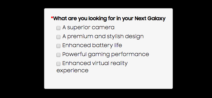 Samsung ฟิลิปปินส์ได้เปิดให้ผู้สนใจในสมาร์ทโฟนรุ่นใหม่ที่กำลังมา “The Next Galaxy” โดยมีหัวข้อฟีเจอร์ที่คาดว่าเป็นฟีเจอร์เด็ดของรุ่นนี้ให้เลือกด้วยว่าต้องการแบบไหน แล้วทำการลงทะเบียนด้วยชื่อ อีเมล และเบอร์โทร