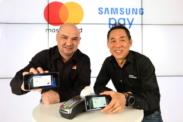 ซัมซุง นำโดย นายวิชัย พรพระตั้ง รองประธานองค์กร ธุรกิจโทรคมนาคมและไอที (ขวา) และ มาสเตอร์การ์ด นำโดย มร. แอนโทนิโอ คอร์โร ผู้จัดการประจำประเทศไทยและพม่า (ซ้าย) มอบข้อเสนอสุดพิเศษเพื่อสมาชิกบัตรเครดิตมาสเตอร์การ์ดที่ใช้งาน “ซัมซุง เพย์ (Samsung Pay)” การชำระเงินรูปแบบใหม่ด้วยบัตรเครดิตผ่านสมาร์ทโฟนที่ใช้ง่าย สะดวก ปลอดภัย ที่ได้เปิดให้ใช้งานในเมืองไทยแล้ว ให้ผู้ใช้งานมีสิทธิ์ลงทะเบียนรับคูปองเงินสดมูลค่า 400 บาท* ณ ห้างสรรพสินค้า ร้านค้า และโรงภาพยนตร์ที่ ร่วมรายการ โดยสามารถนำคูปองดังกล่าวไปใช้เป็นส่วนลดสำหรับสินค้าและบริการได้ที่ร้านค้าชั้นนำมากมาย ได้แก่