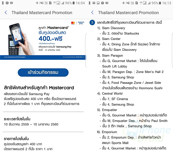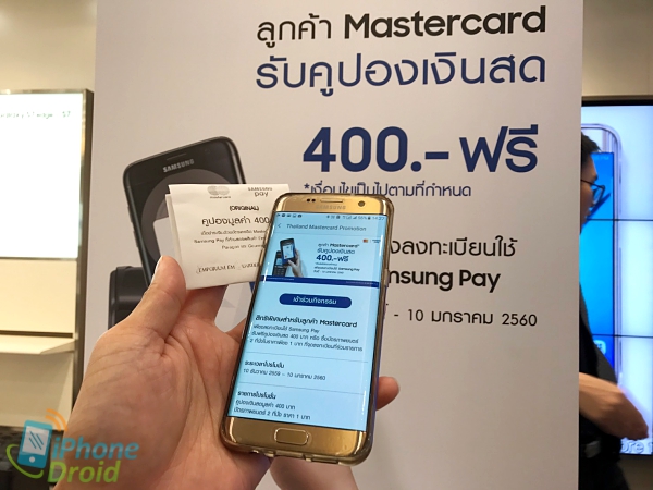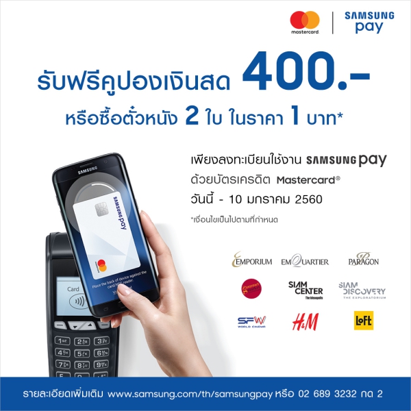 ช่วงนี้ Samsung Pay มีโปรโมชั่นดี ๆ ออกมาอีกแล้ว ซึ่งถ้าใครเดินช้อปภายในห้างชั้นนำหรือตาม Samsung Brand Shop บางสาขาก็จะเห็นมีบูธของ Samsung Pay ตั้งป้ายแจกคูปองช้อปฟรี 400 บาท เพียงเพิ่มบัตร MasterCard เข้าไปในระบบเท่านั้นเอง