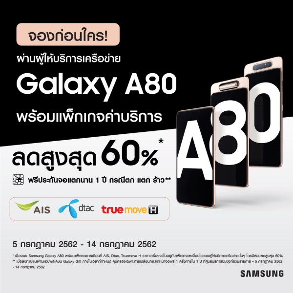 ทั้งนี้ของสมนาคุณทั้ง 2 อย่างมีจำนวนจำกัด! โดยผู้ที่สั่งซื้อจะได้รับของสมนาคุณพร้อมกับรับเครื่อง กาแลคซี่ เอ 80 ระหว่างวันที่ 18 – 20 กรกฎาคม 2562 ณ Samsung Brand Shop หรือร้านค้าที่ได้ทำการจองสินค้า เรียกได้ว่าถูกใจทั้งเหล่าบลิ๊งค์และตอบโจทย์ผู้ที่ชื่นชอบประสบการณ์การฟังเพลงขั้นเทพอย่างแน่นอน มากไปกว่านั้นหากจองผ่านผู้ให้บริการเครือข่ายยังจะได้รับส่วนลดสูงสุด 60% เมื่อจองพร้อมแพคเกจค่าบริการ ยังไม่หมดเพียงเท่านี้ มีการรับประกันหน้าจอนาน 1 ปี ในกรณีตก แตก หรือร้าว มูลค่าสูงสุด 3,500 บาท รับสิทธิ์ง่าย ๆ โดยลงทะเบียนผ่านแอปพลิเคชั่น Galaxy Gift ตามเงื่อนไขที่กำหนด ซัมซุง กาแลคซี่ เอ 80 มีให้เลือกทั้งหมด 3 สี ได้แก่ สี Phantom Black, สี Angel Gold, และสี Ghost White วางจำหน่ายที่ราคา 21,990 บาท สามารถตรวจสอบเงื่อนไขและรายละเอียดโปรโมชั่นเพิ่มเติมได้ที่https://www.samsung.com/th/smartphone/galaxya