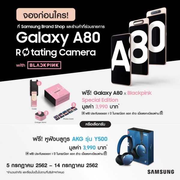 พิเศษสุด ๆ สำหรับ Galaxy A80 x Blackpink Exclusive boxset เปิดตัวที่ราคา 32,990 บาทในจำนวนจำกัด โดยภายในเซทประกอบด้วย 1. Galaxy A80 2. Galaxy Buds 3. Galaxy watch active ความพิเศษอยู่ที่ทั้งสามชิ้นนั้นเป็น Exclusive Design พร้อม Official Blackpink Logo เรียกได้ว่าเป็น Must have item ของชาว Blink กันเลยทีเดียว เปิดจองเพียง 3 วันเท่านั้น ตั้งแต่ 12- 14 กรกฎาคม 2562 ที่ Samsung Brand Shop ที่ร่วมรายการ หรือซื้อผ่านซัมซุงออนไลน์ช็อป (www.samsung.com/th/galaxy-a80-special) ในช่วงเวลาดังกล่าว โดยจะรับของได้ตั้งแต่วันที่ 5 สิงหาคม 2562 เป็นต้นไป ติดตามรายละเอียดเพิ่มเติมที่เว็บไซต์ของซัมซุง