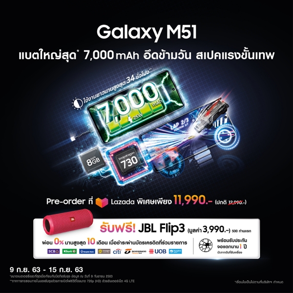 ซัมซุงเปิดตัวสมาร์ทโฟนรุ่นล่าสุดในตระกูล M Series “Galaxy M51 (กาแลคซี่ เอ็ม 51)” ที่มาพร้อมกับฟีเจอร์แบบจัดเต็มด้วยแบตเตอรี่อึดทนนาน หน้าจอ Infinity-O ขนาดใหญ่แสดงผลเต็มตา พร้อมประสิทธิภาพเร็วแรงด้วย RAM 8GB กับกล้องห้าตัวแบบจัดเต็ม พิเศษสุด! ในราคา 11,990 บาท เมื่อซื้อสินค้าในช่วงพรีออเดอร์ และในราคาพิเศษเพียง 10,990 บาท สำหรับช่วง Flash Sale ในวันที่ 9 กันยายน 2563 เวลา 00.01 -23.59 น. ที่ลาซาด้าเท่านั้น