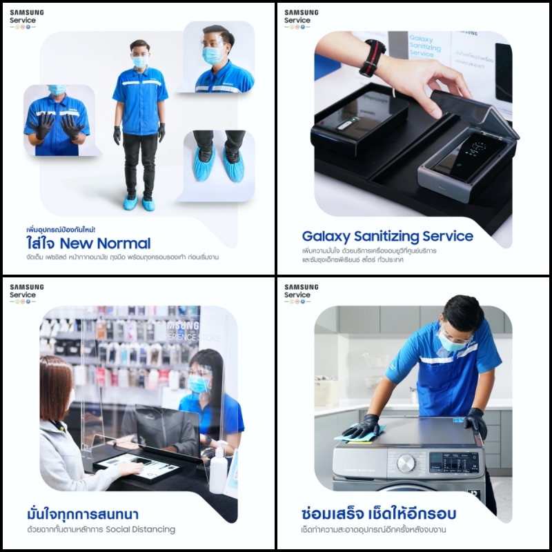- รักษาความสะอาดในทุกกระบวนการ พนักงานของซัมซุงจะใช้เจลแอลกอฮอล์ทำความสะอาดมือทุกครั้งที่ปฎิบัติงาน ทำความสะอาดพื้นที่ศูนย์บริการโดยเฉพาะจุดสัมผัสต่างๆ ด้วยสเปรย์และน้ำยาฆ่าเชื้อโรค อย่างต่อเนื่อง และช่วยทำความสะอาดอุปกรณ์ของลูกค้าหลังซ่อมเสร็จ ด้วยบริการ Galaxy Sanitizing Service ที่ซัมซุงจัดเตรียมเครื่องอบทำความสะอาดด้วยรังสียูวี-ซี ในทุกศูนย์บริการ รวมถึงซัมซุง