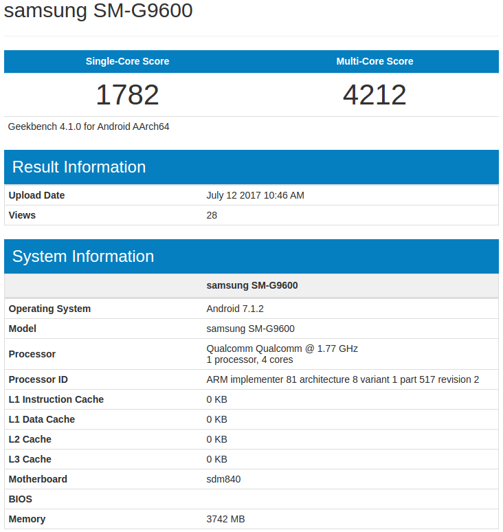 Samsung SM-G9600 with Snapdragon 840 (!) and 4 GB RAM. Seems like an S8 "Lite" to me. https://t.co/yEcxR663Hn pic.twitter.com/6ZSPJ2p4pi
