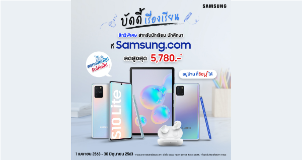 ซัมซุงจัดโปรเอาใจน้อง ๆ นักเรียน นักศึกษา ช่วง Study from Home สนุกกับการเรียนที่บ้านแบบจัดเต็มครบเซท กับโปรโมชั่นพิเศษ “บัดดี้เรื่องเรียน” ที่ขนตัวช่วยให้น้อง ๆ สนุกกับการเรียนออนไลน์ได้ทุกที่ ทุกเวลา อาทิ Galaxy Tab S6, Galaxy S10 Lite, Galaxy N10 Lite และ Galaxy Buds+ (White)