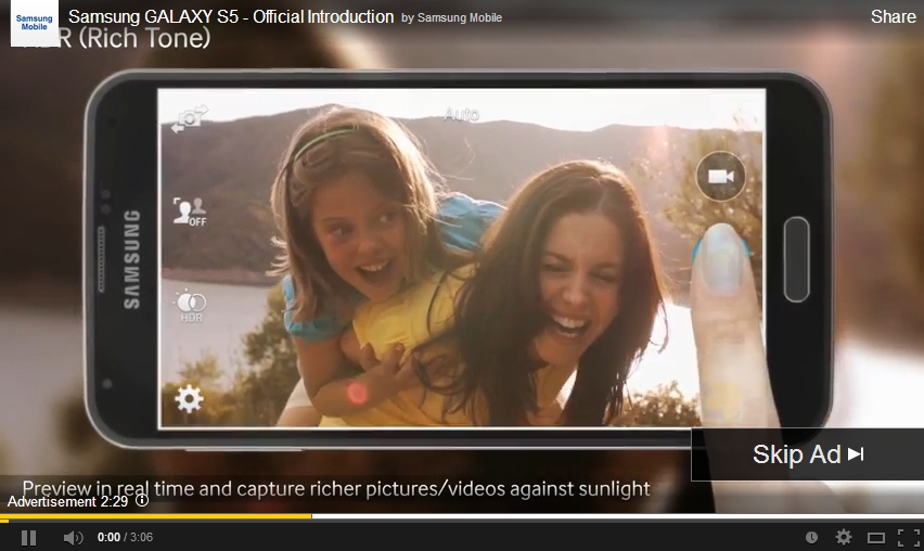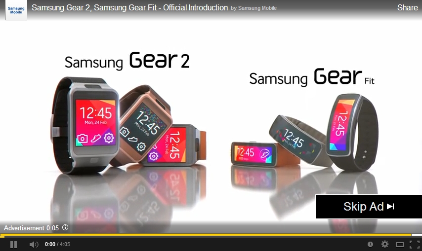 โฆษณา Samsung Galaxy S5, Gear 2 และ Gear Fit ถูกฝังและแสดงบนคลิปวิดีโอ YouTube ให้ผู้ใช้งานจำใจต้องดูก่อนที่จะเล่นคลิปวิดีโอนั้น ๆ