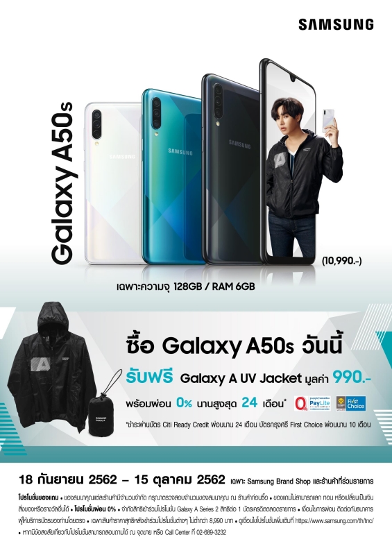 สำหรับผู้ที่ซื้อ กาแลคซี่ เอ 50 เอส รุ่นความจุ 128 กิกะไบต์ แรม 6 กิกะไบต์ ระหว่างวันที่ 18 กันยายน – 15 ตุลาคม 2562 รับสินค้าสุดเอ็กซ์คลูซีฟ Galaxy A UV Jacket มูลค่า 990 บาท พร้อมรับสิทธิ์ผ่อน 0% นานสูงสุด 24 เดือน เมื่อชำระด้วยบัตร Citi Ready Credit Card หรือเลือกผ่อน 0% นาน 10 เดือน เมื่อชำระสินค้าด้วยบัตรกรุงศรีเฟิร์สช้อยส์ เฉพาะที่ Samsung Brand Shop และร้านค้าที่ร่วมรายการ สามารถติดตามรายละเอียดเกี่ยวกับสิทธิพิเศษเพิ่มเติมได้ที่ http://www.samsung.com/th/galaxy-a50s/