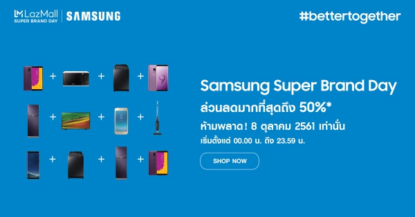 ซัมซุงจับมือลาซาด้า เปิดตัว ซัมซุง x ลาซาด้า ซุปเปอร์แบรนด์เดย์ (Samsung x Lazada Super Brand Day)#BetterTogether ในวันที่ 8 ตุลาคม 2561 ซึ่งเป็นแคมเปญระดับภูมิภาคที่จัดขึ้นสำหรับการช้อปปิ้งออนไลน์สุดพิเศษบนลาซาด้าตลอด 24 ชั่วโมง ตั้งแต่ 00.00 – 23.59 น. ของวัน โดยแคมเปญดังกล่าวจัดขึ้นเพื่อฉลองความร่วมมือครบรอบ 3 ปีของทั้งสองบริษัทฯ พร้อมมอบส่วนลดพิเศษสินค้าซัมซุงสูงสุดถึง 50% แก่ลูกค้าทุกคน