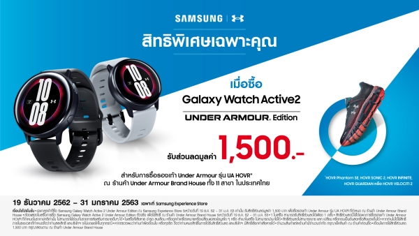 ซัมซุง ร่วมกับ อันเดอร์ อาร์เมอร์ ส่งโปรโมชั่นสุดพิเศษเอาใจนักวิ่งและสายออกกำลังกาย เมื่อซื้อ Galaxy Watch Active2 Under Armour Edition ที่ ซัมซุง เอ๊กซ์พีเรียนซ์ สโตร์ ระหว่างวันที่ 19 ธันวาคม 2562 – 31 มกราคม 2563 รับส่วนลดมูลค่า 1,500 บาท สำหรับซื้อรองเท้า Under Armour HOVR Run Series (รุ่น HOVR PHANTOM SE, HOVR SONIC 2, HOVR INFINITE, HOVR GUARDIAN หรือ HOVR VELOCITI 2) ที่ อันเดอร์ อาร์เมอร์ แบรนด์เฮ้าส์ ทั้ง 11 สาขาในประเทศไทย เพียงแสดงใบเสร็จการซื้อตัวจริงเพื่อใช้สิทธิ์ภายในวันที่ 31 มกราคม 2563