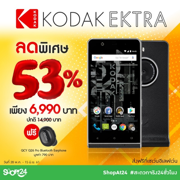 ShopAt24.com ลดราคาสมาร์ทโฟน Kodak Ektra จากราคาปกติ 14,900 บาท ลดเหลือเพียง 6,990 บาท พร้อมของแถมพิเศษ QCY Q26 Pro Bluetooth Earphone มูลค่า 790 บาท ส่งฟรีที่เซเว่นอีเลฟเว่น ตั้งแต่วันนี้ – 15 มิ.ย. 61 รายละเอียดเพิ่มเติม – https://bit.ly/2ksTEKd