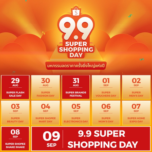 กลับมาอีกครั้งอย่างยิ่งใหญ่กับ Shopee 9.9 Super Shopping Day เทศกาลช้อปปิ้งประจำปีที่ใหญ่ที่สุดในเอเชียตะวันออกเฉียงใต้และไต้หวัน ขาช้อปเตรียมเฮกับดีลใหญ่สุดพิเศษแห่งปีจากกว่า 800,000 ร้านค้า แบรนด์สินค้าชั้นนำร่วม1,000 แบรนด์ สิทธิพิเศษจากแบรนด์พันธมิตรกว่า 60 แบรนด์ และซูเปอร์ธีมเดย์สุดคุ้มตลอด 12 วัน