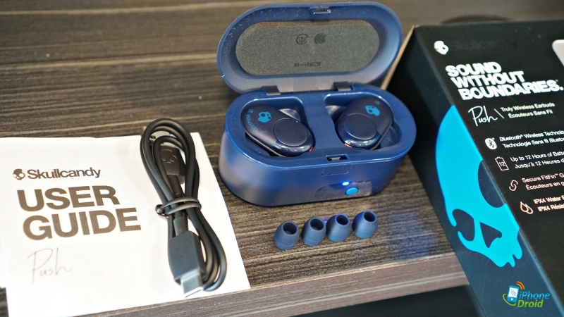 Skullcandy Push Truly Wireless Earbuds เป็นหูฟังที่มีสีสันสวยโดดเด่น ขนาดเล็กกะทัดรัด สีที่นำมารีวิวกันในครั้งนี้คือสี Indigo Blue (สีน้ำเงิน) ตัวหูฟังมี Driver ขนาดใหญ่ 9.2 มิลลิเมตร เชื่อมต่อด้วย Bluetooth เวอร์ชั่น 4.2 มาพร้อมเคสชาร์จแบตเตอรี่ได้ในตัว