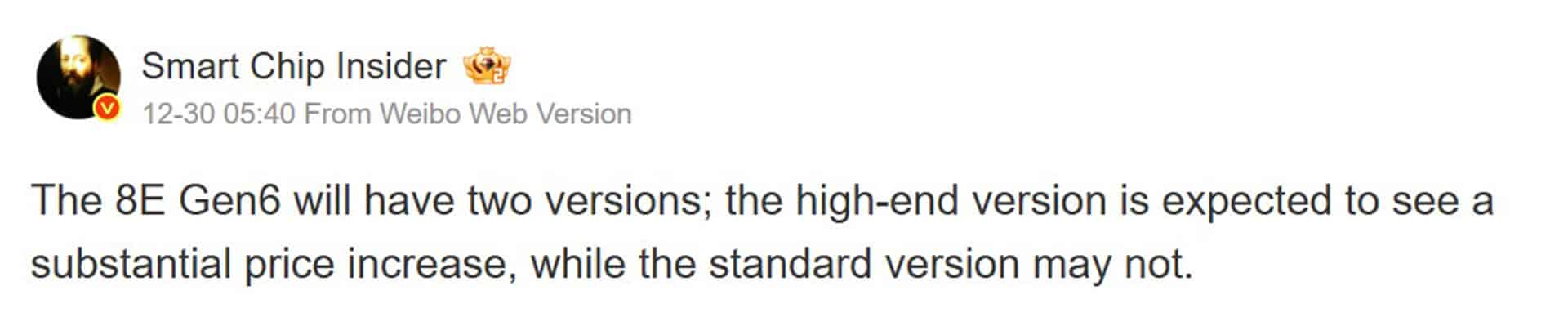 แม้ว่าราคาของชิปนี้อาจจะไม่ถึง 300 ดอลลาร์ แต่ก็ยังมีราคาที่สูงอยู่ดี ซึ่งทำให้อาจถูกใช้งานแค่ในสมาร์ทโฟนรุ่น Ultra เท่านั้น ส่วนเรือธงรุ่นปกติจะใช้เป็น Snapdragon 8 Gen 6 รุ่นปกติ ที่น่าจะใช้คอร์แบบ 2+3+3 คอร์ และรองรับ RAM LPDDR5X ที่จริงๆ แม้ว่าจะไม่ได้รองรับ LPDDR6 แบบรุ่น Pro แต่ก็ยังให้ประสิทธิภาพขั้นสูงอยู่ดี