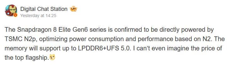 จอมหลุด Digital Chat Station บอกว่า Snapdragon 8 Elite Gen 6 จะเปิดตัวภายในเดือนกันยายนปี 2026 โดยจะใช้กระบวนการผลิตขนาด 2nm (N2p) จาก TSMC โดยมีการประหยัดะพลังงานและมีประสิทธิภาพสูงกว่ารุ่นก่อนหน้าด้วย