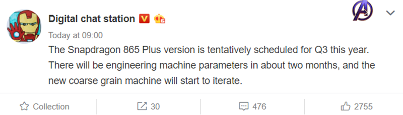 บัญชี Digital Chat Station ใน Weibo ได้เปิดเผยข้อมูลดังกล่าวออกมาว่า Snapdragon 865+ จะตัวในช่วงเวลาดังกล่าว และรุ่นต้นแบบ (Prototype) จะเริ่มใช้งานได้ในอีก 2 เดือน หรือประมาณเมษายนนี้