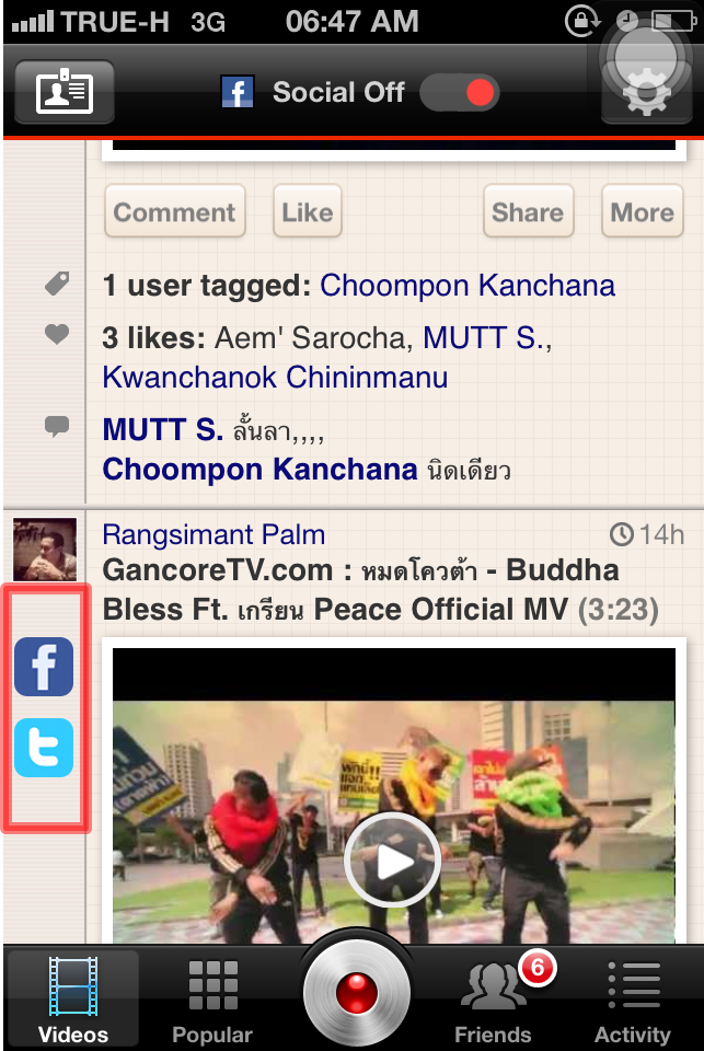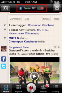 หากต้องการเปิดการแชร์ดูวีดีโอ คอมเม้นต์ หรือกด like ให้แชร์ยัง Facebook สามารถเปิดจากหน้าจอหลัก Feed ได้ทันที โดยการเลือก On และสำหรับในการปิดไม่ให้มีการโชว์ไปยัง Facebook สามารถดูการตั้งค่าได้จากที่นี่ Tips: วิธีตั้งค่าจากแอพฯ Socialcam ไม่ให้แชร์การดูวีดีโอ ,Comment,Like ไป Facebook อัตโนมัติ!!!