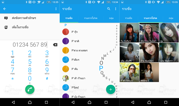 เมนูการโทร มีแป้นพิมพ์ตัวเลขดูเรียบง่ายสบายตา ส่วนในเมนูรายชื่อติดต่อจะแบ่งออกเป็น 3 แท็บหลัก ๆ ได้แก่ รายชื่อทั้งหมด, รายการโปรด และกลุ่ม