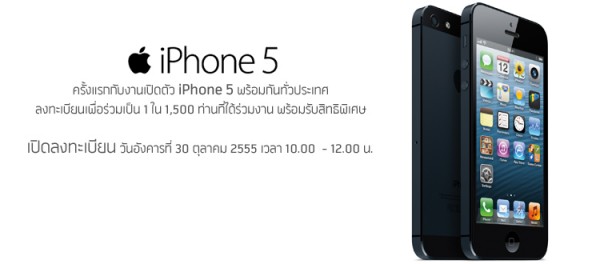 ร่วมเป็น 1 ใน 1,500 ท่านแรก เพื่อร่วมงานเปิดตัว iPhone 5 พร้อมกัน 4 แห่ง ทั่วประเทศ กรุงเทพฯ เชียงใหม่ ขอนแก่น และภูเก็ต พร้อมรับสิทธิพิเศษในงาน