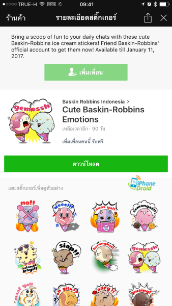 - Cute Baskin-Robbins Emotions อายุการใช้งาน 90 วัน ดาวน์โหลดได้ถึงวันที่ 11 ม.ค. 60 http://line.me/R/shop/detail/7643