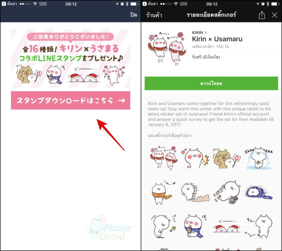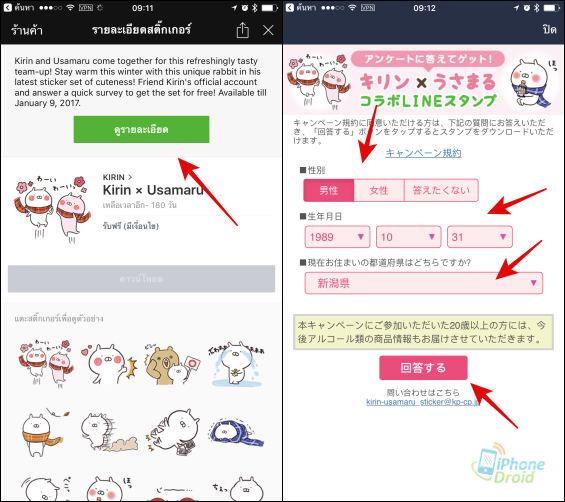 Kirin x Usamaru อายุการใช้งาน 180 วัน ดาวน์โหลดได้ถึงวันที่ 9 ม.ค. 60 http://line.me/R/shop/detail/7620 วิธีโหลดแตะไปที่ “ดูรายละเอียด” ตอบแบบสอบถามเลือกไปตามรูปด้านล่างนะครับ ช่องถัดไปกรอกวันเดือนปีเกิด และอันที่ 3 เลือกอันไหนก็ได้นะครับ และสุดท้ายแตะไปที่ปุ่มล่างสุด