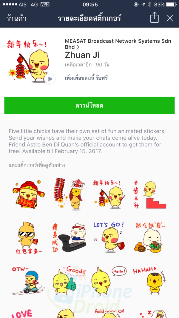 - Zhuan Ji line://shop/detail/7820 สติกเกอร์น้องไก่น่ารัก ๆ ต้อนรับตรุษจีน โหลดฟรีถึงวันที่ 15 กุมภาพันธ์นี้เท่านั้น