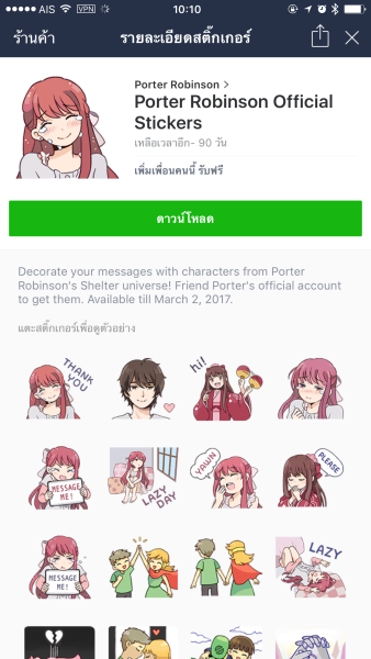 - Porter Robinson Official Stickers อายุการใช้งาน 90 วัน ดาวน์โหลดได้ถึงวันที่ 2 มี.ค. 60 http://line.me/R/shop/detail/7926