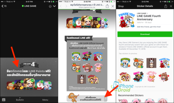 จากนั้นให้เลือกตามขั้นตอนตามภาพด้านล่างนี้นะครับ เพียงแค่นี้ก็จะได้สติกเกอร์ “ครบรอบ 4 ปี LINE GAME” ไปใช้กันได้แล้วครับ สามารถโหลดได้ตั้งแต่วันนี้ – 17 ธันวาคม 2559 นี้เท่านั้น