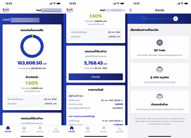 เมื่อทำเสร็จแล้ว เราก็เข้ามาอยู่ในหน้าหลักที่จะบอกทั้งยอดเงินต้นคงเหลือ, ยอดรวมที่ต้องชำระในแต่ละงวด และมีรายการเดินบัญชีให้ได้ดูย้อนหลังด้วย