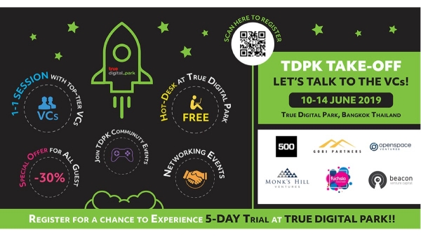 ทรู ดิจิทัล พาร์ค ชวนเหล่าสตาร์ทอัพ ฟรีแลนซ์ และผู้ประกอบการรุ่นใหม่ยุค 4.0 มานั่งทำงานฟรี 10-14 มิ.ย.นี้เท่านั้น ที่ ทรู ดิจิทัล พาร์ค ที่เดียว ทุกความเป็นไปได้ พร้อมจัดงาน “TDPK Take-Off…Let’s Talk to the VCs” สัมผัสประสบการณ์สมาชิกใหม่ของทรู ดิจิทัล พาร์ค ที่เป็นมากกว่าที่ทำงานแบบเดิมๆ สะดวกสบายกับที่นั่งทำงานสไตล์ Open Space รูปแบบใหม่ พร้อมโอกาสพบปะกับเหล่านักลงทุนระดับโลกหรือ VC ที่จะมาให้คำปรึกษาแบบ 1-on-1 Session ตลอด 5 วันเต็ม และร่วมอีเว้นต์สร้างแรงบันดาลใจและเพิ่มทักษะสำคัญที่สตาร์ทอัพต้องมี จากกูรูวงการสตาร์ทอัพ และ VC ที่จะมาแลกเปลี่ยนประสบการณ์ เพื่อต่อยอดธุรกิจในหลากหลายแง่มุม และยังมีกิจกรรมไลฟ์สไตล์ต่างๆ เสริมชีวิตการทำงานให้มีสีสันในทุกๆ วัน