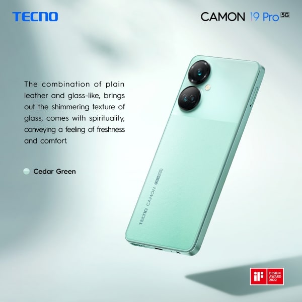 TECNO CAMON 19 PRO รุ่น 5G ใช้ชิปเซ็ต MediaTek Dimensity 810 5G ประสิทธิภาพแรงยิ่งกว่า หน่วยประมวลผล Arm Cortex-A76 ใน Octa-Core CPU สามารถทำความเร็วได้สูงสุดถึง 2.4GHz แสดงผลหน้าจอที่เร็วกว่ากับจอความถี่ 120Hz ดาวน์โหลดวิดีโอในไม่กี่วินาที วิดีโอคอลหรือเล่นเกมลื่นไหลไม่สะดุด รองรับเทคโนโลยีเกมมิ่ง HyperEngine 2.0 ของ MediaTek พร้อม NFC หรือ New Field Communication ซึ่งสามารถส่งผ่านข้อมูลได้แบบแตะแล้วอ่าน สำหรับใช้แทนกระเป๋าตังค์เพื่อชำระค่าโดยสาร ค่าอาหาร ฯลฯ กล้องหลัง 3 ตัว 64MP + 2MP + 2MP กล้องหน้า 16MP Pro ที่มีคุณสมบัติกล้อง AI ระดับไฮเอนด์ ให้สัมผัสอรรถรสทางสายตาชั้นเยี่ยมจากการปรับภาพด้วย AI-Bokeh และสัมผัสสีสันเต็มตาด้วย AI-Color พร้อมแฟลชทั้งกล้องหน้าและกล้องหลัง การันตีดีไซน์ที่หรูหราล้ำสมัยจนได้รับรางวัล iF Design Award 2022 ซึ่งเป็นหนึ่งในรางวัลการออกแบบเชิงอุตสาหกรรมที่ทรงอิทธิพลที่สุดในระดับโลกเมื่อเมษายน 2565 ที่ผ่านมา