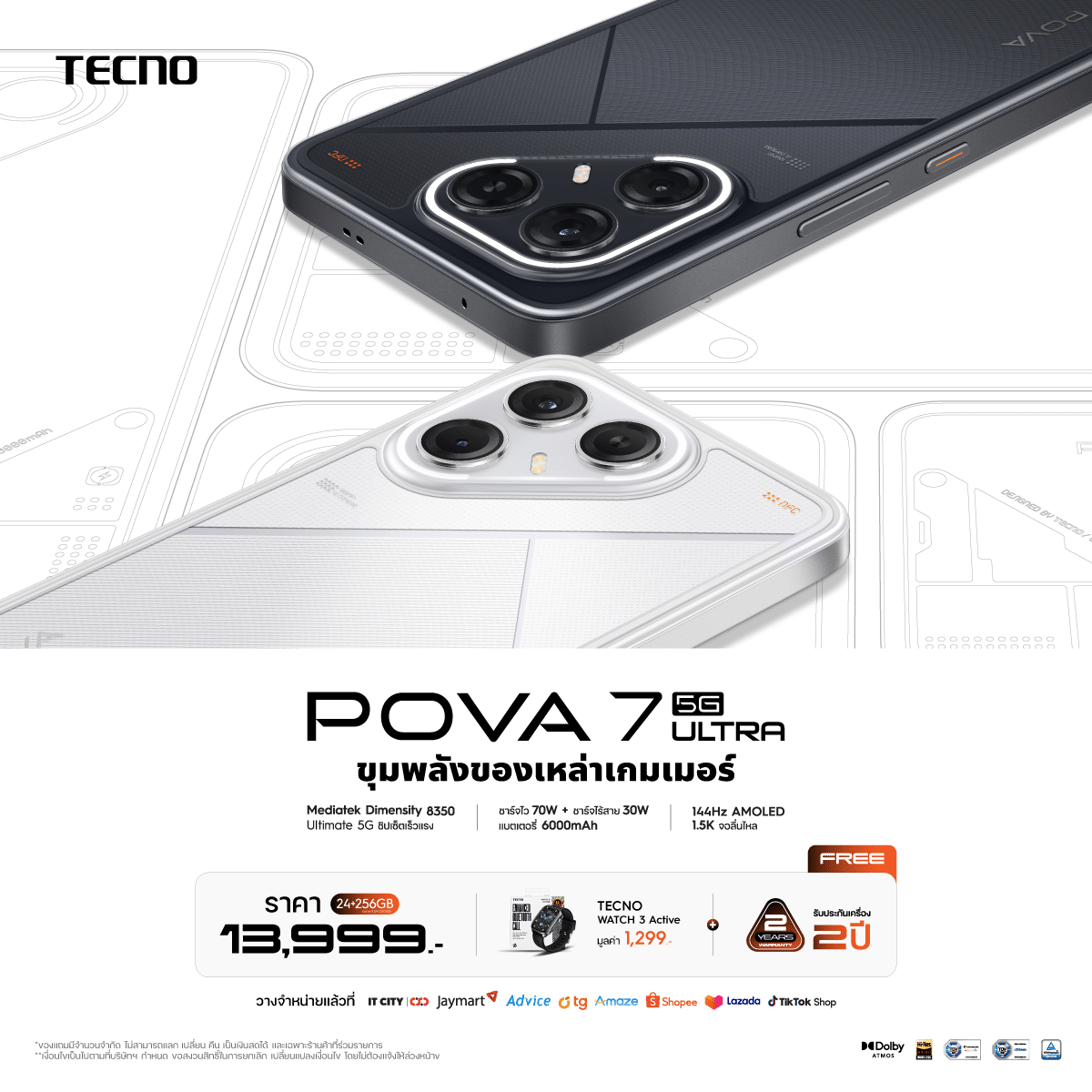 TECNO POVA 7 Ultra 5G มีให้เลือกทั้งหมด 2 สี คือ สีขาว Greek White และสีดำ Greek Black มีราคาในรุ่น 12GB + 256GB อยู่ที่ 13,999 บาท พร้อมรับฟรี ! ประกันตัวเครื่อง 2 ปี และ TECNO Active Watch 3 มูลค่า 1,299 บาท