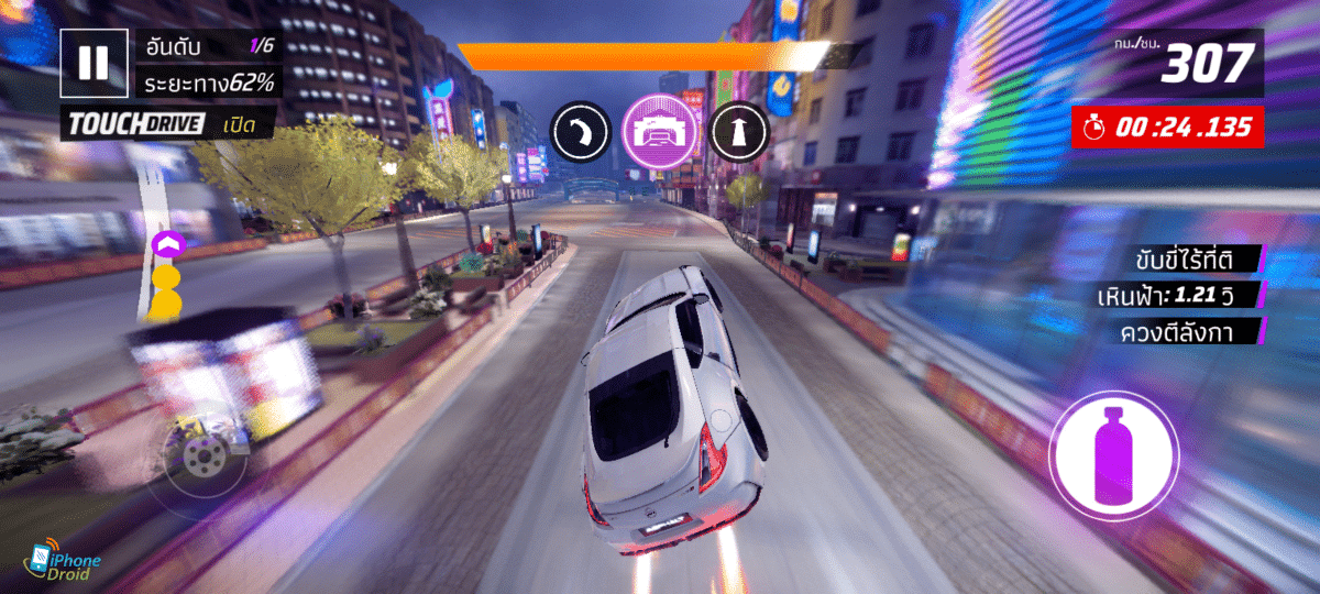 และเกมสุดท้ายที่เราเล่นจะเป็นเกมแข่งรถภาพสวยๆ อย่าง Asphalt Legends สามารถเปิดภาพกราฟิกสูงสุดได้เลย รวมถึงเฟรมเรท 60FPS ด้วย บอกเลยว่าเล่นได้แบบลื่นๆ ภาพสวยคมกริบจริงๆ ทั้งตอนเล่นจริงหรือช่วง Cut Scene เห็นรายละเอียดของแต่ละส่วนได้ดีมาก ทั้งแสง เงา ความสวยของตัวรถยนต์ หรือเศษรถยนต์ในตอนที่มีการชน