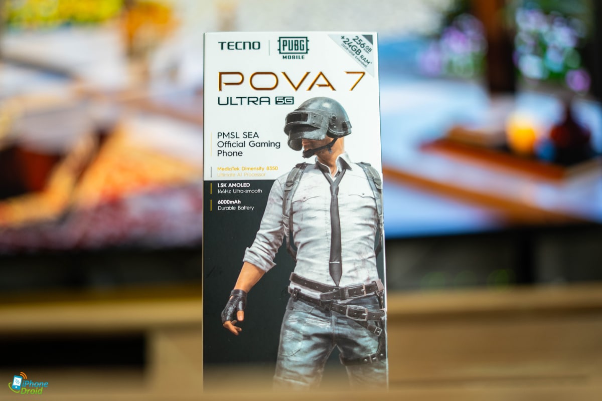 TECNO POVA 7 Ultra 5G มีการจับมือกับเกม PUBG Mobile ที่จะเห็นตั้งแต่หน้ากล่องเลยว่าจะมีตัวละครของเกมนี้อย่างเด่นชัด พร้อมด้วยชื่อรุ่นด้านบน