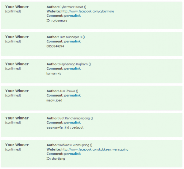ประกาศรายชื่อผู้โชคดี 50 ท่านที่ได้รับ Stickers LINE 11 แบบฟรี โดย Wattana S. 9 ธ.ค. 2012 ผู้เขียน Wattana S. 9 ธ.ค. 2012 191 รายชื่อผู้โชคดี 50 ท่านที่ได้รับ Stickers LINE 11 แบบฟรี ฉลอง 30,000+ แฟนเพจ กับกิจกรรมร่วมลุ้นรับสติ๊กเกอร์ฟรี 11 แบบ [yframe url=’http://www.youtube.com/watch?v=54kO9tC4qqU’] ผู้โชคดีรอรับสติ๊กเกอร์ได้เลย อาจใช้เวลาในการจัดส่งภายในวันที่ 9/12/12 และคอยติดตามกิจกรรมต่อไปด้วยนะครับ :-) 0 FacebookTwitterPinterestTelegram โพสต์ก่อนหน้า Samsung Galaxy S IV จะมาในเดือนเมษายนปี 2013 [ข่าวลือ] โพสต์ถัดไป แจกฟรี LINE สติ๊กเกอร์ 50 ไอดีแรกเท่านั้น รับสติ๊กเกอร์ 2 แบบฟรี “Will Pan” และ “Zero yogurt”