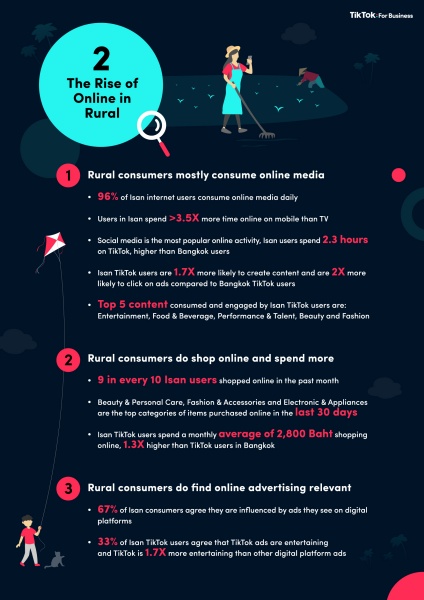 จากการสำรวจของ TikTok [4] เราพบว่าผู้บริโภคในพื้นที่ภาคตะวันออกเฉียงเหนือ 84% มีส่วนร่วมกับสื่อออนไลน์อย่างน้อย 1 สื่อต่อวัน และ TikTok อยู่ใน 3 อันดับแรกของแพลตฟอร์มที่พวกเขาส่วนใหญ่ใช้เวลาในแต่ละวัน ที่น่าสนใจคือ ผู้ใช้ TikTok ในภาคตะวันออกเฉียงเหนือและในกรุงเทพฯ ต่างมีทัศนคติและความคล้ายคลึงกันในแง่พฤติกรรม ที่สามารถเข้าใจและเข้าถึงโลกดิจิทัลได้อย่างลึกซึ้ง พวกเขามักจะใช้เทคโนโลยีในชีวิตประจำวันหรือท่องโลกออนไลน์เพื่ออำนวยความสะดวกให้ตัวเองมากยิ่งขึ้น (ผู้ใช้ TikTok ภาคตะวันออกเฉียงเหนือ 82% เทียบกับผู้ใช้ TikTok ในกรุงเทพฯ 89%) นอกจากนี้ ผู้ใช้ในภาคตะวันออกเฉียงเหนือยังเปิดรับประสบการณ์ใหม่ๆ และถือเป็นกลุ่ม Early Adopter ที่ชอบเป็นคนกลุ่มแรกที่ได้ทดลองใช้ผลิตภัณฑ์และบริการใหม่ๆ ซึ่งมีความคล้ายคลึงกับผู้ใช้ในกรุงเทพฯ (ผู้ใช้ TikTok ภาคตะวันออกเฉียงเหนือ 63% เทียบกับผู้ใช้ TikTok ในกรุงเทพฯ 64%) ตามผลสำรวจของกสทช. ยังพบข้อมูลอินไซต์ของพฤติกรรมผู้บริโภคในภาคตะวันออกเฉียงเหนืออีกว่า พวกเขาอยู่ในอันดับหนึ่งที่โลกออนไลน์มีอิทธิพลต่อการตัดสินใจ และซื้อของผ่านสื่อออนไลน์เป็นหลัก โดยที่แม้แต่กรุงเทพฯ ยังตามมาเป็นลำดับ 3 ซึ่งนั่นหมายความว่า โฆษณาออนไลน์ถือเป็นหนึ่งในพื้นที่หลักที่แบรนด์สามารถสื่อสารและโน้มน้าวให้ผู้บริโภคกลุ่มนี้ให้มีการตอบสนองกับแบรนด์ได้อย่างแน่นอน และจากบริบทนี้ เท่ากับว่าผู้บริโภคที่มีภูมิลำเนาในภาคตะวันออกเฉียงเหนือได้กลายเป็นประตูสู่โอกาสใหม่ๆ ที่แบรนด์ควรจะพิจารณาเพื่อเข้าถึงต่อไป เพราะพฤติกรรมผู้บริโภคภาคตะวันออกเฉียงเหนือและกรุงเทพฯ นั้น มีความใกล้เคียงกันอย่างยิ่ง