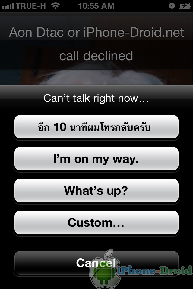 หรือหากเลือกที่ Custom… ก็จะเข้าไปที่หน้าการส่ง sms ตอบกลับ หรือถ้าหากคนที่โทรหาเราใช้ iMessage ก็จะตอบกลับในรูปแบบ iMessage ได้ครับผม