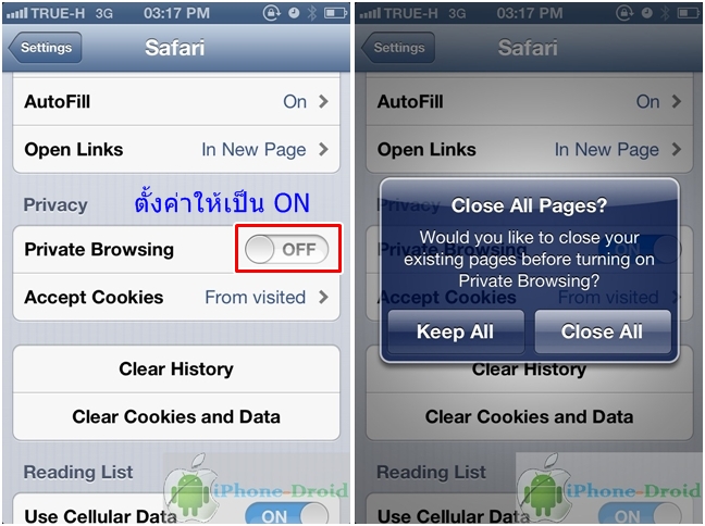 วิธีการตั้งค่านั้นให้ไปที่ Settings > Safari > Privacy > Private Browsing และเลือกจาก OFF เป็น ON ครับ หลังจากนั้นหน้าจอจะถาม Keep All ถ้าเราไม่ต้องการปิดหน้า browser ทั้งหมดที่เปิดอยู่ให้เลือก Keep All หรือหากต้องการปิด browser ที่เปิดอยู่ทั้งหมดให้เลือก Close All ครับ