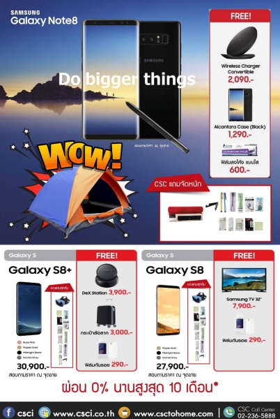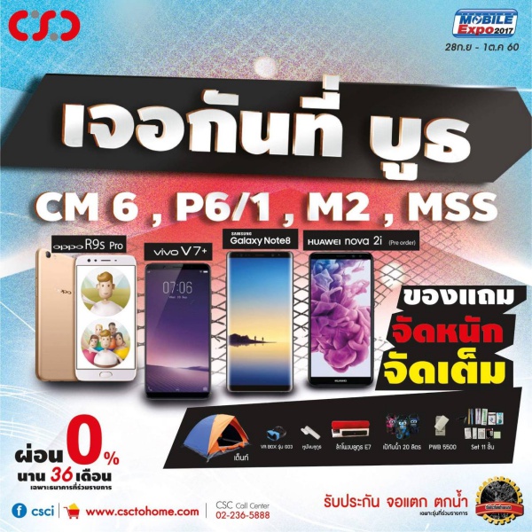 สุดพิเศษภายในงาน Thailand Mobile Expo 2017 ตั้งแต่วันนี้ – 1 ตุลาคม 2560 ณ.ศูนย์ประชุมแห่งชาติสิริกิติ์ …พบกันที่บูธ CSC พร้อมโปรโมชั่นจัดเต็มของสมนาคุณกันแบบจุใจจากมือถือแบรนด์ดัง อาทิเช่น Samsung Galaxy Note8 หรือแม้จองเป็นเจ้าของก่อนใครกับ Huawei Nova 2i แต่ที่พึ่งเปิดตัวไป และยังมีมือถือรุ่นสเปคเทพอีกมากมาย พร้อมจ่ายกันแบบสบายๆ ผ่อน 0 % นานสูงสุด 10 เดือนกับธนาคารชั้นนำ