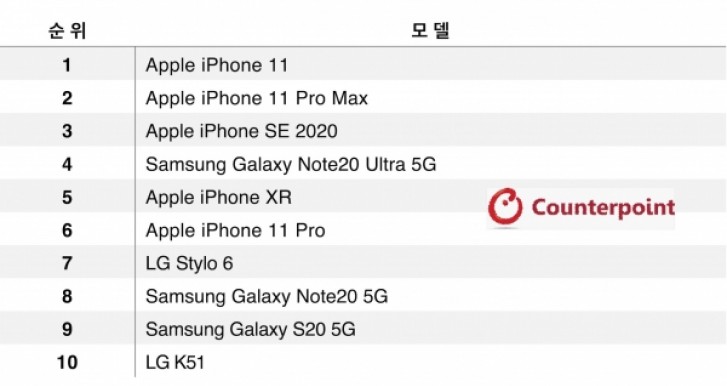 ขณะที่อันดับ 7 – 10 นั้นเป็น LG Stylo 6, Galaxy Note20 5G, Galaxy S20 5G และ LG K51