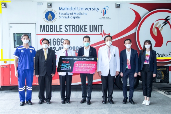 กลุ่มทรูจับมือกับศูนย์โรคหลอดเลือดสมองศิริราช คณะแพทยศาสตร์ศิริราชพยาบาล และคณะวิศวกรรมศาสตร์ มหาวิทยาลัยมหิดล นำศักยภาพเทคโนโลยี True5G เครือข่ายอัจฉริยะเชื่อมต่อเพิ่มประสิทธิภาพรถรุ่นใหม่หน่วยรักษาอัมพาตเคลื่อนที่ศิริราช2020 (Siriraj Mobile Stroke Unit) โดยนำศักยภาพเทคโนโลยี True5G เครือข่ายอัจฉริยะของกลุ่มทรู ซึ่งมีจุดเด่นทั้งเรื่องของศักยภาพความเร็วสูง ความหน่วงต่ำ และความสามารถในการเชื่อมต่ออุปกรณ์หลากหลาย สามารถส่งภาพสแกนสมองที่มีขนาดใหญ่และสัญญาณชีพของผู้ป่วยได้อย่างรวดเร็วแบบเรียลไทม์ และมีความละเอียดสูง ส่งผลให้วางแผนการรักษาได้ทันทีและแม่นยำก่อนผู้ป่วยจะเดินทางมาถึงโรงพยาบาล โดยเชื่อมต่อด้วยซิม True5G-Ready และอุปกรณ์รับสัญญาณ CPE5Gผ่านเครือข่ายอัจฉริยะTrue5G ที่ได้ติดตั้งภายในโรงพยาบาล และตลอดเส้นทางที่รถพยาบาลวิ่งผ่าน ทำให้เพิ่มความแม่นยำในการควบคุม มีประสิทธิภาพสูงในการเชื่อมต่อ ซึ่งเป็นการเพิ่มโอกาสของการเข้าถึงการรักษาในระยะฉุกเฉินให้กับผู้ป่วยโรคหลอดเลือดสมองเฉียบพลันทั้งชนิดตีบและแตก ลดระยะเวลาของการรักษาเพื่อเปิดหลอดเลือด ในผู้ป่วยโรคหลอดเลือดสมองตีบหรืออุดตันเฉียบพลัน เพื่อลดอัตราการตายหรือพิการของผู้ป่วยโรคหลอดเลือดสมองเฉียบพลัน เพิ่มประสิทธิภาพในการคัดกรองผู้ป่วยที่มีอาการทางระบบประสาทเฉียบพลัน ที่อาจได้รับประโยชน์จากการดูแลเร่งด่วนได้ในพื้นที่เกิดเหตุ ช่วยเพิ่มโอกาสให้กับผู้ป่วยที่อยู่ห่างไกล และลดความเหลื่อมล้ำในการเข้าถึงบริการทางการแพทย์ขั้นสูงของประชาชนไทย