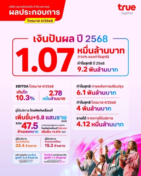 บริษัท ทรู คอร์ปอเรชั่น จำกัด (มหาชน) ประกาศผลการดำเนินงานประจำไตรมาส 4/2568 โดยสามารถทำกำไรสุทธิได้ต่อเนื่องเป็นไตรมาสที่ 4 ติดต่อกัน บริษัทฯ รายงานผลกำไรสุทธิหลังหักภาษีจำนวน 4 พันล้านบาท และกำไรสุทธิหลังปรับปรุงรายการพิเศษ (Normalized Profit) จำนวน 6.1 พันล้านบาท สำหรับ EBITDA ในไตรมาสนี้อยู่ที่ 2.78 หมื่นล้านบาท สะท้อนผลประโยชน์เต็มไตรมาสจากการได้ใบอนุญาตคลื่นความถี่ ทั้งนี้ คณะกรรมการบริษัทฯ มีมติเสนอจ่ายเงินปันผลประจำปีจำนวน 4.1 พันล้านบาท ส่งผลให้เงินปันผลรวมทั้งปีอยู่ที่ 1.07 หมื่นล้านบาท คิดเป็นอัตราการจ่ายเงินปันผล 116% ของ NPAT ตามรายงาน และ 56% ของ NPAT หลังปรับปรุงรายการพิเศษ