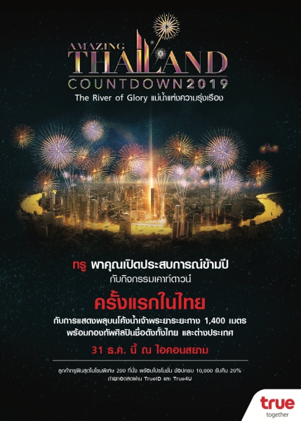 ทรู เชิญชวนชาวไทยนับถอยหลังสู่ปีใหม่ 2019 อย่างยิ่งใหญ่ตระการตา 31 ธันวาคมนี้ ณ ไอคอนสยาม National ICON Landmark ริมแม่น้ำเจ้าพระยา ในงาน “AMAZING THAILAND COUNTDOWN 2019” ภายใต้แนวคิด “แม่น้ำแห่งความรุ่งเรือง” ที่การท่องเที่ยวแห่งประเทศไทย ไอคอนสยาม และพันธมิตร พร้อมชุมชนริมฝั่งแม่น้ำเจ้าพระยา ร่วมกันสร้างสรรค์มหาปรากฏการณ์ งานเฉลิมฉลองส่งท้ายปีเก่าต้อนรับปีใหม่ในสเกลยิ่งใหญ่ที่ไม่เคยเกิดขึ้นมาก่อน โดยทรู ได้จัดโซนเอ็กซ์คลูซีฟรวม 100 ที่นั่ง ให้ลูกค้าชมกิจกรรมไฮไลท์ การแสดงพลุทำจากข้าวเหนียวไทย นวัตกรรมการสร้างสรรค์พลุแบบเป็นมิตรต่อสิ่งแวดล้อม พร้อมการแสดงประวัติศาสตร์เรื่องราวของแม่น้ำเจ้าพระยา สะท้อนให้เห็นวิถีชีวิต อารยธรรม และตำนานของความเป็นสยามประเทศจำนวนทั้งสิ้น 5 องก์ การแสดงโขน ชุด “ยกรบ” ซึ่งเป็นมรดกวัฒนธรรมทางภูมิปัญญาของไทยอันล้ำค่า และการแสดงสดจากศิลปินชั้นนำมากมาย อาทิ ต้น – ธนษิต จตุรภุช, เอม – สาธิดา ปิ่นสินชัย, โบ๊ท – สิริโรจน์ ปริญญานันท์ จากทรู อะคาเดมี่ แฟนเทเชีย / ไอซ์ – ธมลวรรณ กอบลาภธนากูล, โอ – ศิร์ภูมิ เบญจรัส จากเดอะวอยซ์ ไทยแลนด์ / ฮั่น – อิสริยะ ภัทรมานพ, ริท – เรืองฤทธิ์ ศิริพานิช, กันต์ – นภัทร อินทร์ใจเอื้อ จากเดอะสตาร์ และ เกล – สุพิชชา อังคะไวมงคล จากไทยแลนด์ ก็อตทาเลนต์ ซึ่งทรู จะถ่ายทอดสดทางทรูโฟร์ยูช่อง 24 และแอปทรูไอดี ในคืนวันที่ 31 ธันวาคมนี้ ตั้งแต่เวลา 23.00 น.เป็นต้นไป เพื่อเอาใจคนไทยให้ร่วมสนุกไปพร้อมกันทั่วประเทศ