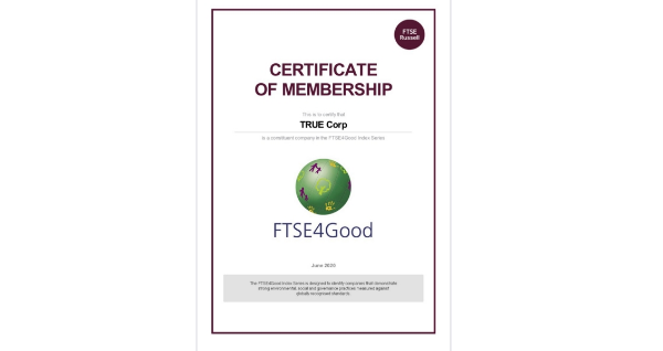 บริษัท ทรู คอร์ปอเรชั่น จำกัด (มหาชน) ได้รับคัดเลือกให้เป็นสมาชิกดัชนีความยั่งยืนระดับโลก FTSE4Good ต่อเนื่องเป็นปีที่ 4 จาก FTSE Russell ในรอบการประเมินเดือนมิถุนายน ปี 2563 ที่ผ่านมา สะท้อนความเป็นองค์กรธุรกิจที่มีความรับผิดชอบต่อสิ่งแวดล้อมและสังคม รวมถึงมีบรรษัทภิบาลที่แข็งแกร่ง ภูมิใจได้รับคะแนนประเมินด้านสิ่งแวดล้อมสูงสุดในกลุ่มอุตสาหกรรมโทรคมนาคมทั่วโลก ซึ่งเป็นผลมาจากความสำเร็จในการบริหารจัดการ การเปลี่ยนแปลงสภาพภูมิอากาศ และมีส่วนร่วมลดผลกระทบต่อสิ่งแวดล้อมในวงกว้าง ผ่านการดำเนินงานลดการปล่อยก๊าซเรือนกระจก ลดการใช้ไฟฟ้า ลดการใช้น้ำ จัดการขยะ ตลอดจนเพิ่มสัดส่วนการใช้พลังงานทดแทนและพลังทางเลือก ตามเป้าหมายในการดำเนินธุรกิจอย่างยั่งยืน