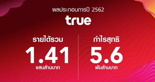 กลุ่มทรู รายงานผลการดำเนินงานที่ดีขึ้น ผลักดันกำไรสุทธิปี 2562เป็น 5.6 พันล้านบาท โดยกำไรจากการดำเนินงานซึ่งไม่รวมกำไรจากการขายสินทรัพย์เข้ากองทุนรวมโครงสร้างพื้นฐานโทรคมนาคม ดิจิทัล (DIF) เติบโตเป็น 4.7 พันล้านบาท เทียบกับผลขาดทุนประมาณ 1.0 พันล้านบาทในปีก่อน ผลประกอบการที่เติบโตสูงขึ้นนี้มาจากรายได้ของทรูมูฟ เอช ที่เพิ่มสูงเหนืออุตสาหกรรม ที่ร้อยละ 6.7 จากปีก่อน ด้วยฐานผู้ใช้บริการเพิ่มขึ้นสุทธิ 1.4 ล้านรายในปี 2562 พร้อมเดินหน้านำคลื่นความถี่ใหม่ที่ประมูลได้มาอย่างคุ้มค่าตามแผนที่วางไว้ทั้งคลื่นย่าน 2600MHz และ 26GHz มาเสริมความแข็งแกร่งของกลุ่มทรูในฐานะผู้นำเครือข่ายที่ดีที่สุด โดยปัจจุบัน ทรูเป็นโอเปอเรเตอร์ที่มีคลื่นครบมากสุดในอุตสาหกรรม และครอบคลุมถึง 7 ย่านความถี่ ผนวกกับการมีพันธมิตรชั้นนำทั้งในประเทศและระดับโลก รวมถึงระบบนิเวศด้านดิจิทัลของกลุ่มทรูที่ครอบคลุมและครบครัน จะสร้างการเติบโตได้อย่างยั่งยืนพร้อมตอบโจทย์ความต้องการของลูกค้าชาวไทยในยุคปัจจุบันได้โดดเด่นและเหนือกว่า ทั้งนี้ ทรูเดินหน้าสู่การจ่ายเงินปันผลให้ผู้ถือหุ้นได้อย่างต่อเนื่อง โดยที่ประชุมคณะกรรมการบริษัทฯ ได้อนุมัติการจ่ายเงินปันผล 3.0 พันล้านบาท คิดเป็น 0.09 บาทต่อหุ้น โดยจะนำเสนอที่ประชุมสามัญผู้ถือหุ้นในเดือนเมษายนนี้