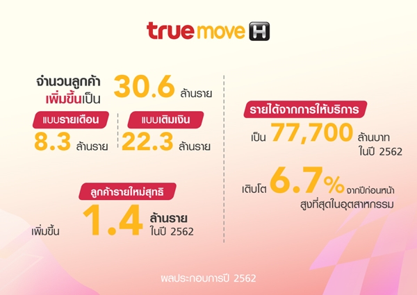ทรูมูฟ เอช เติบโตเหนืออุตสาหกรรมทั้งในด้านรายได้และฐานผู้ใช้บริการอย่างต่อเนื่อง โดยรายได้จากการให้บริการเพิ่มขึ้นร้อยละ 11.3 จากช่วงเดียวกันของปีก่อนในไตรมาส 4 และร้อยละ 6.7 เมื่อเทียบกับปีก่อน เป็น 7.77 หมื่นล้านบาทในปี 2562 นับเป็นการเติบโตที่สูงกว่าอุตสาหกรรมติดต่อกันเป็นปีที่เจ็ด โดยการเติบโตแข็งแกร่งนี้เป็นผลหลักมาจากรายได้ระบบรายเดือนที่เพิ่มขึ้นในอัตราเลขสองหลัก ผลตอบรับที่ดีต่อแคมเปญที่ผสานกับดีไวซ์ โดยเฉพาะรุ่นที่เอ็กซ์คลูซีฟกับทรูมูฟ เอช รวมถึงการขยายช่องทางการจัดจำหน่ายผสานเครือข่ายพันธมิตรที่แข็งแกร่ง ในขณะเดียวกัน ทรูมูฟ เอช มุ่งตอบโจทย์ความต้องการของแต่ละกลุ่มลูกค้าให้ตรงจุดมากขึ้นด้วยกลยุทธ์ทางการตลาดแบบจุลภาค ส่งผลให้เป็นผู้ให้บริการรายใหญ่เพียงรายเดียวที่มีฐานผู้ใช้บริการระบบเติมเงินเพิ่มขึ้นสุทธิในระหว่างปี ทำให้มีรายได้จากบริการระบบเติมเงินเพิ่มขึ้นแม้สภาวะการแข่งขันยังคงอยู่ในระดับสูง ทั้งนี้ ในปี 2562 ทรูมูฟ เอช มีจำนวนผู้ใช้บริการรายใหม่สุทธิประมาณ 1.4 ล้านราย ส่งผลให้ฐานลูกค้ารวมเพิ่มขึ้นเป็น 30.6 ล้านราย แบ่งเป็นลูกค้าระบบรายเดือน 8.3 ล้านรายและลูกค้าระบบเติมเงิน 22.3 ล้านราย ความมุ่งมั่นอย่างต่อเนื่องของทรูมูฟ เอช ในการเป็นผู้ให้บริการรายแรกที่นำเสนอเทคโนโลยีล้ำสมัยให้กับผู้บริโภค แพลตฟอร์มดิจิทัลและสิทธิประโยชน์ การวิเคราะห์ข้อมูล รวมถึงช่องทางการจัดจำหน่ายที่มีประสิทธิภาพ จะเป็นปัจจัยผลักดันให้ทรูมูฟ เอช เติบโตอย่างยั่งยืน ในยุค 5G ที่กำลังจะมาถึง
