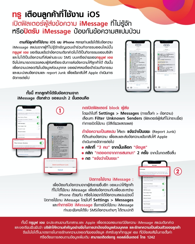 ทั้งนี้ หากลูกค้าได้รับข้อความจาก imessage ดังกล่าว ขอแนะนำ 2 ขั้นตอนคือ